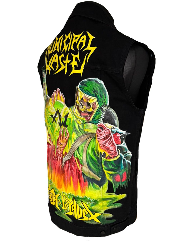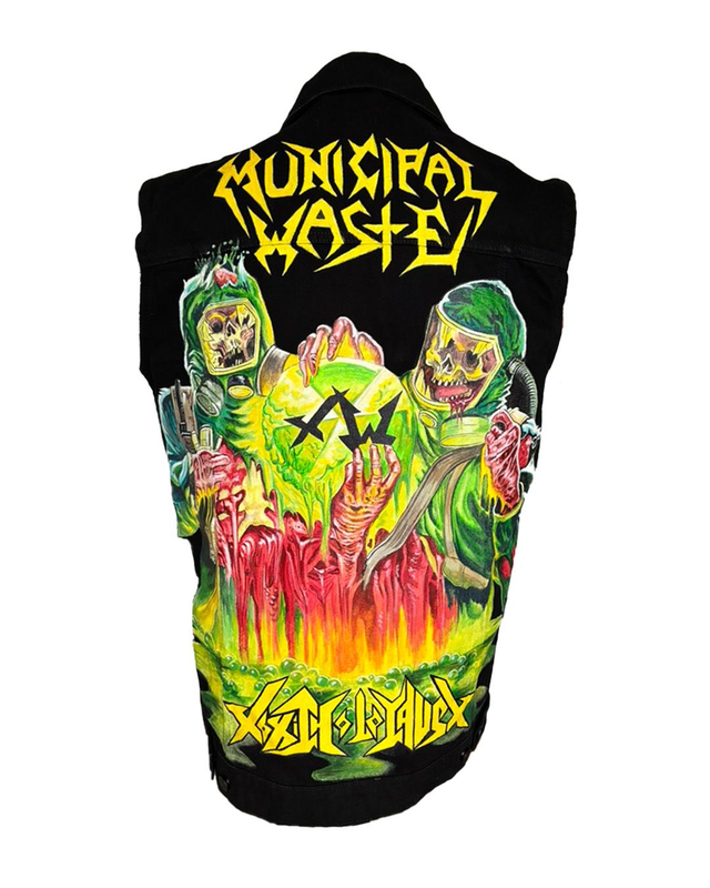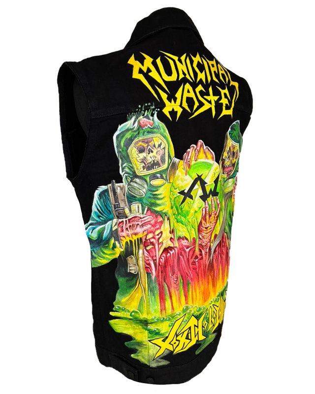 Black denim vest/cutte with hand painted artwork from the split EP 'Toxic Waste' by Municipal Waste and Toxic Holocaust.