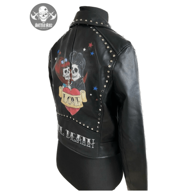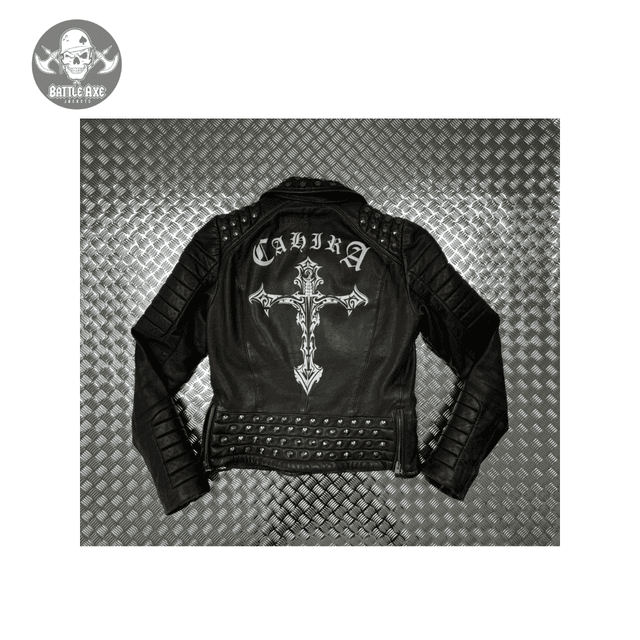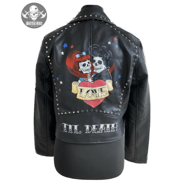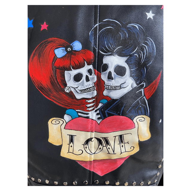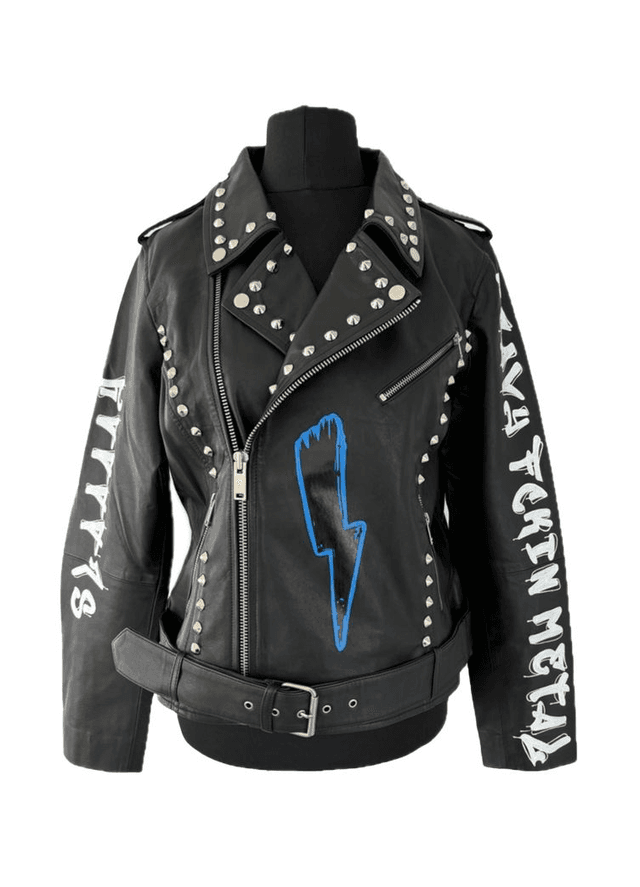 Handcrafted metal stud detailing and hand painted artwork on this badass biker jacket.